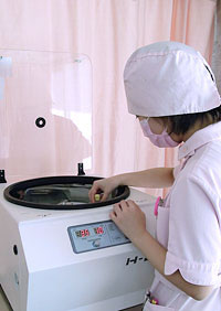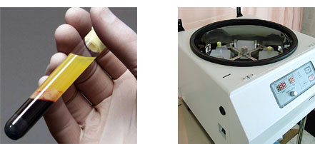 ヘソの中に3〜4mmの小さな穴を開け、ヘソの周りのお腹の脂肪を少量(20〜30cc)、脂肪吸引で吸い出します。吸引したキレイな脂肪からコンデンス脂肪細胞と自己コラーゲンを遠心分離器で抽出します。自分の血液をさらに20ccほど採血し、そこから血小板や線維芽細胞などの成長因子を抽出して、自己コラーゲンとコンデンス脂肪細胞に混ぜます。そうすると、自己コラーゲンの定着率がアップし、さらに成長因子により新しいコラーゲンが再生されます。注射器で目の上や、目の下、頬や鼻唇溝の窪んだ部分に注入します。顔はいっさい切らず、注射器で注入しますので、傷は残りません。脂肪吸引の際に開けた傷も一針縫いますが、傷跡は残りません。